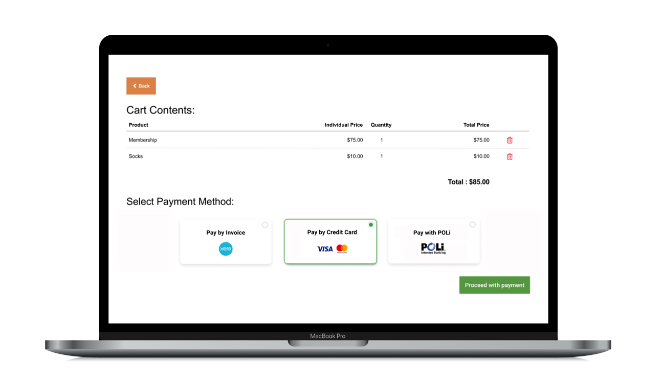 If you use Xero or MYOB, then Sporty can raise the invoice for you automatically and even mark it as 'paid' once payment has been made.